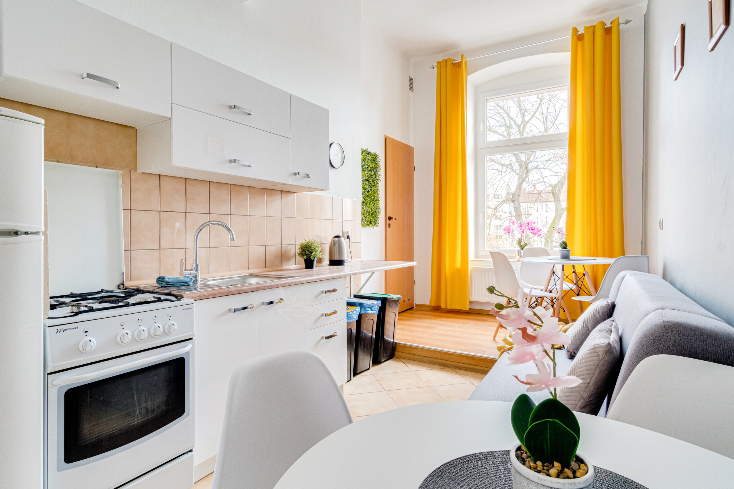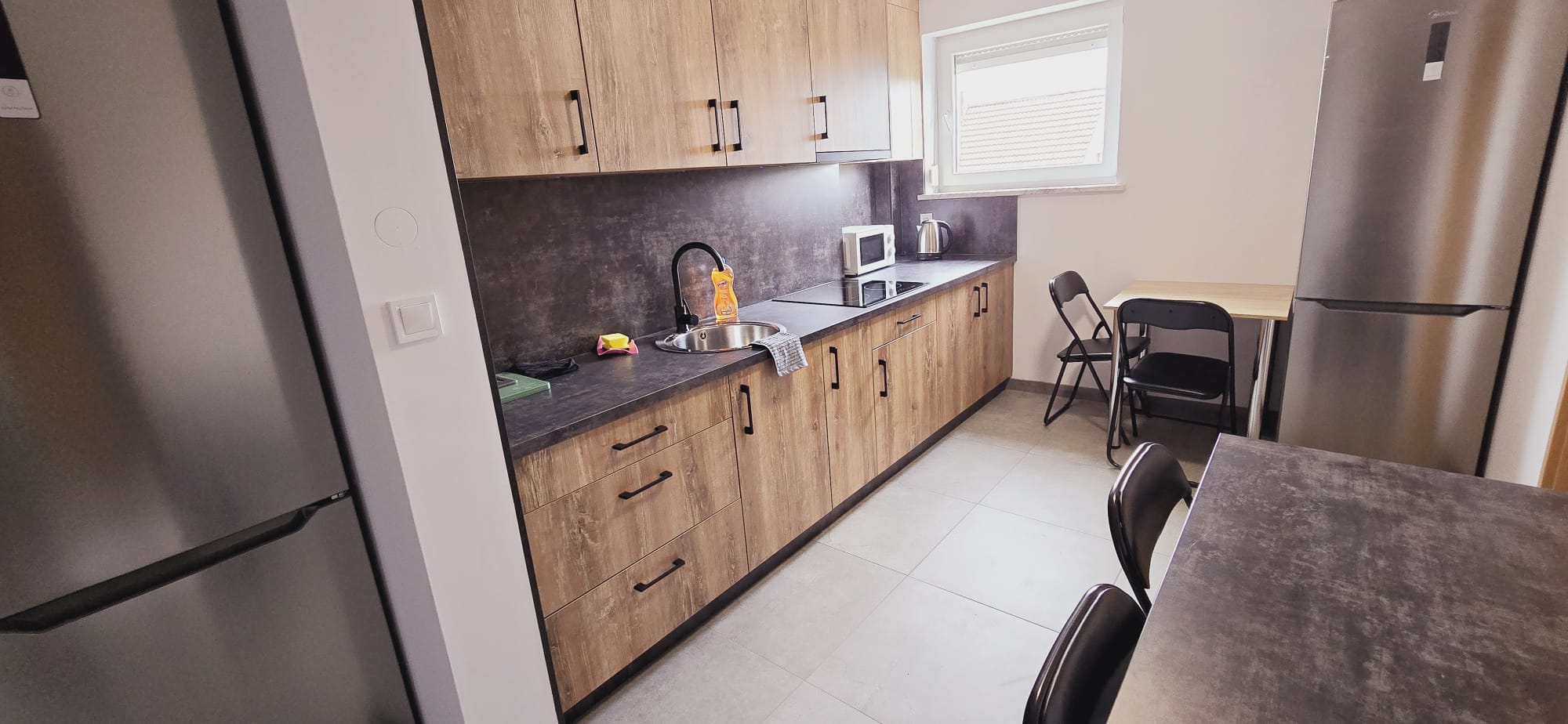 - kuchnie w pełni wyposażone (lodówko-zamrażarki, mikrofalówki, czajniki, piece (przy Niedurnego, Walecki i Ozimskiej z piekarnikami)